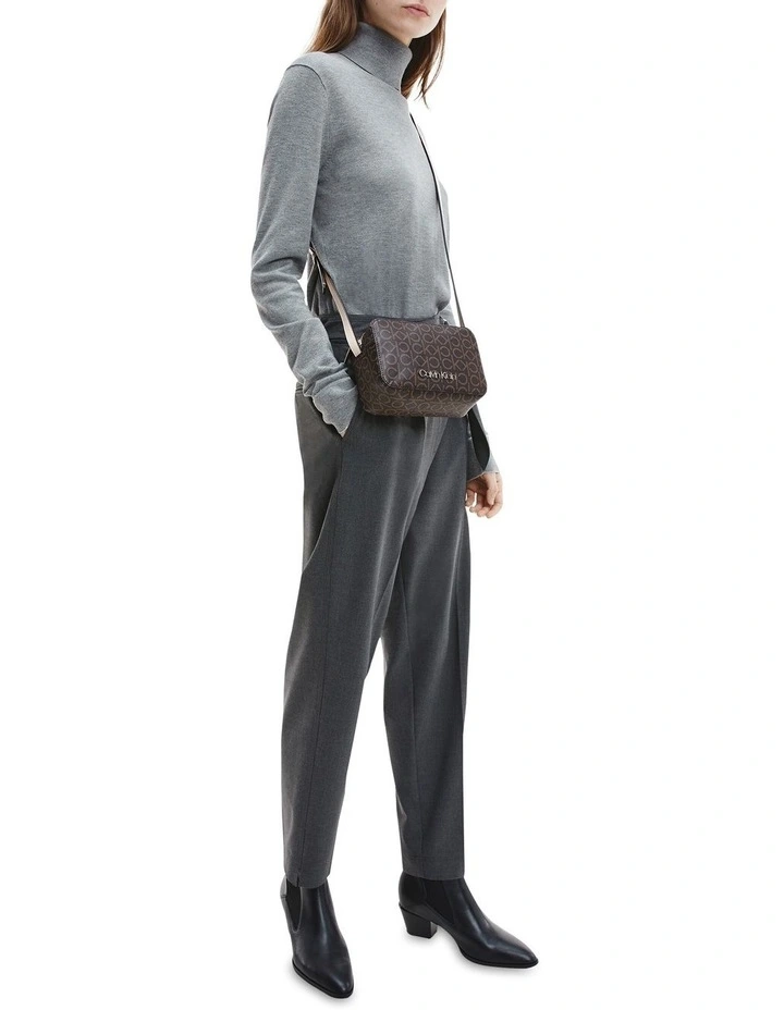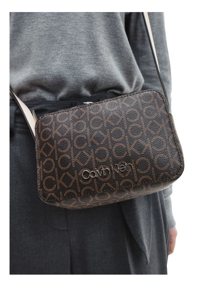 A faux leather camera bag with crossbody strap and zip closure. Complete with buckle detailing and a signature logo plaque to the front.
