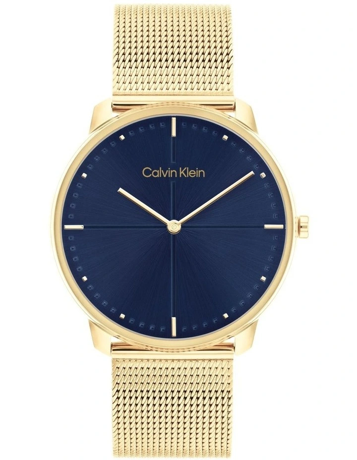 Minimalist feel. Clean, quadrant-inspired dial surrounded by a smooth, sculptural case featuring a mesh bracelet.