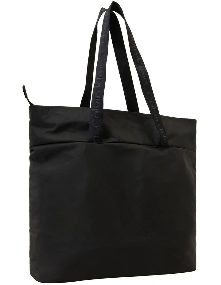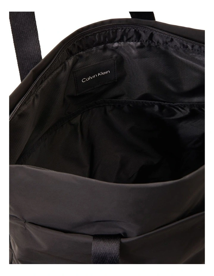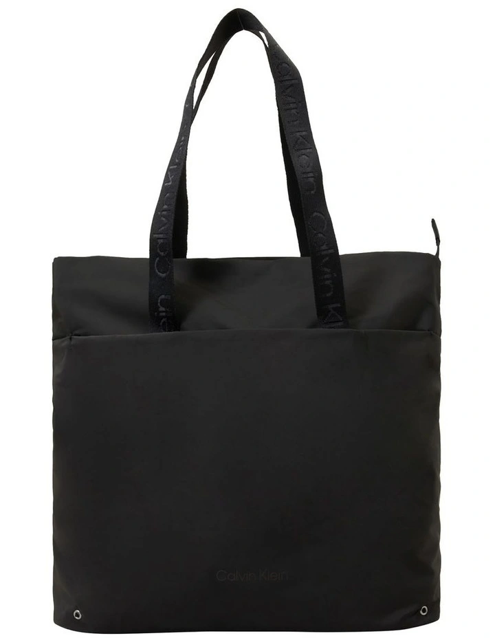 This tote bag features two sets of handles, interior slot pocket, and a Calvin Klein logo on the front.